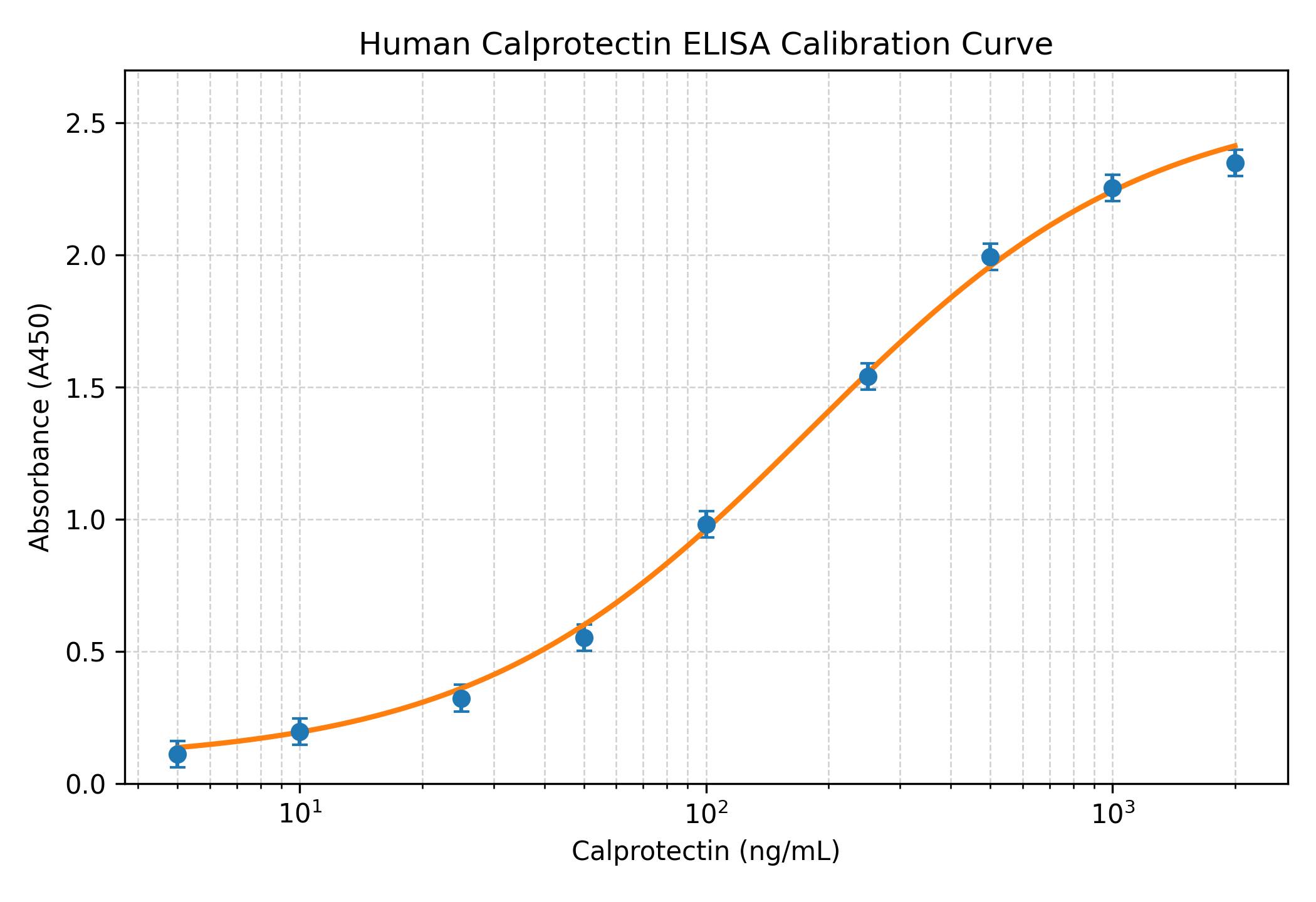 • Mean absorbance values are plotted against calprotectin concentration on a semi-logarithmic scale.