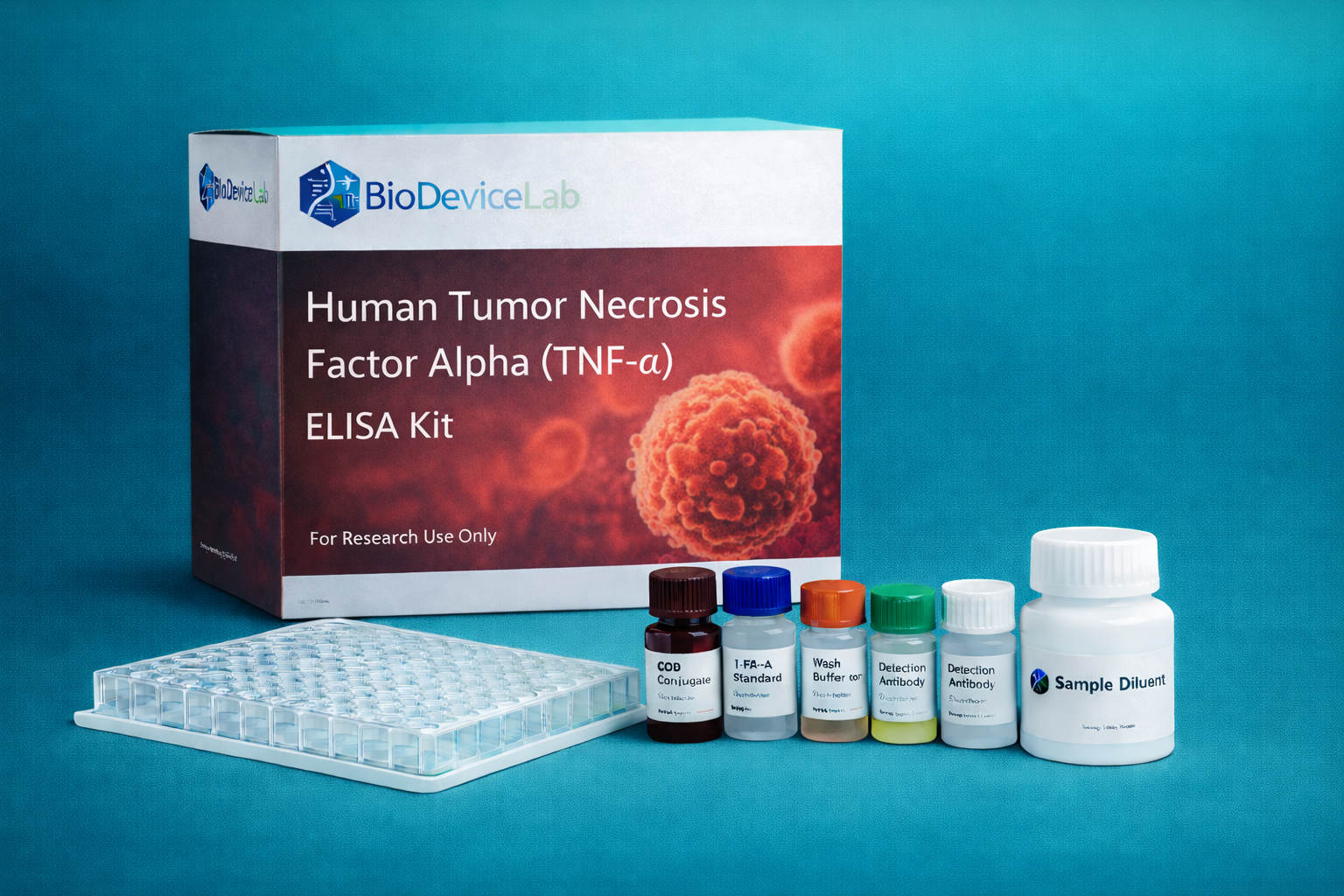 The BioDeviceLab Human Tumor Necrosis Factor Alpha (TNF-α) ELISA Kit is a high-performance enzyme-linked immunosorbent assay developed for the quantitative determination of TNF-α in biological samples. TNF-α is a central pro-inflammatory cytokine produced by immune cells and epithelial cells in response to microbial products, tissue injury, and inflammatory stimuli.