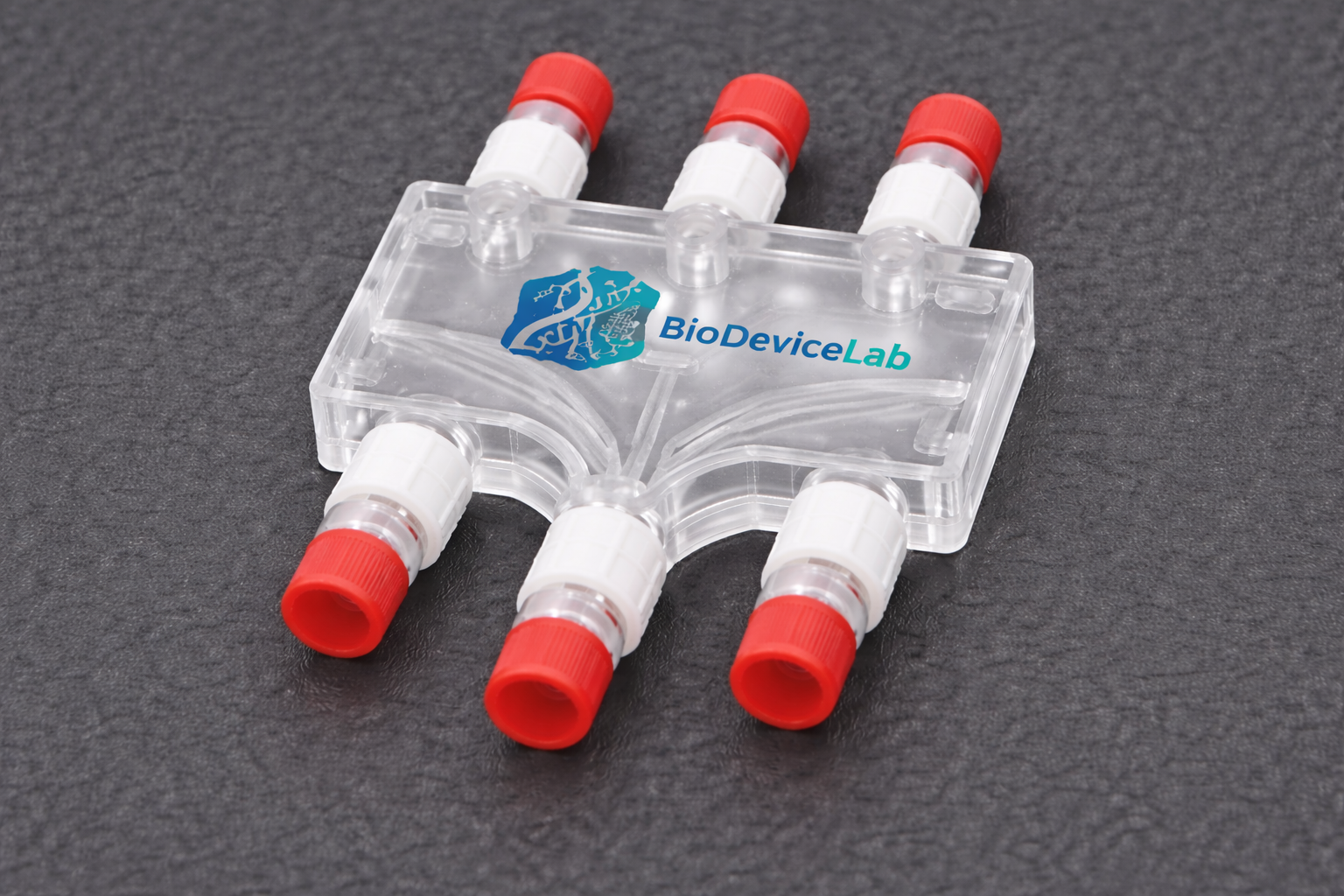 The BioDeviceLab Mini Luer Interface Module (3-Inlet / 3-Outlet) is designed for parallel fluid handling and distribution using standard Mini-Luer fittings. Fabricated from an optically transparent, lab-grade polymer, the module allows direct visualization of fluid paths while maintaining chemical compatibility with a wide range of biological and chemical reagents. Its balanced, low dead-volume channel architecture supports reproducible fluid routing, making it ideal for multiplexed assays, parallel testing, and advanced microfluidic system integration.