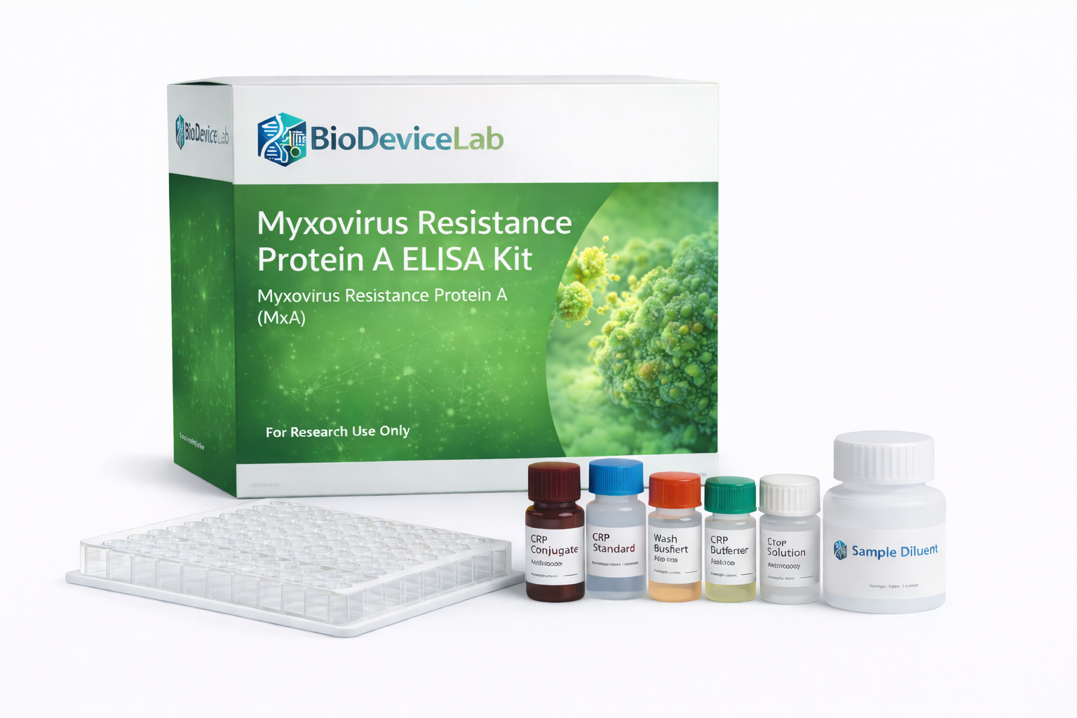 The BioDeviceLab Myxovirus Resistance Protein A (MxA) ELISA Kit is a high-performance sandwich enzyme-linked immunosorbent assay developed for the quantitative determination of human MxA in biological samples. MxA is an interferon-induced dynamin-like GTPase and a well-established biomarker of type I interferon (IFN-α/β) activity. Its expression is strongly upregulated during acute viral infections and interferon-driven immune responses, while remaining low in most bacterial infections.