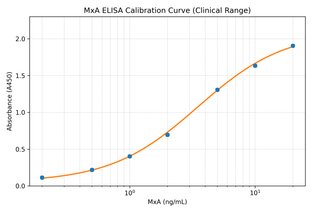 Because of this host-response specificity, MxA is widely used to differentiate viral from bacterial infections, to monitor antiviral immune activation, and to study interferon pathway dynamics. This assay combines high analytical sensitivity, excellent specificity, and robust reproducibility, enabling reliable MxA quantification for both conventional laboratory research and advanced biodevice validation workflows.
